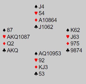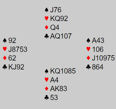 Ved det ene bordet havnet Skiens Ø/V i 4 hjerter etter at syd (Arild Rasmussen) hadde åpnet med en konstruktiv svake 2 spar (8-10 poeng). Per Erik Austberg spilte ut spar knekt og forsvaret hadde ingen problemer med å få fatt i fire motspillstikk, HEIMDAL +100.