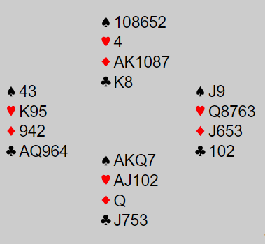 I teorien kan imdilertid N/S hente de elleve første stikkene i motspill mot 3NT, syv sonebet! Da må syd finne et usannsynlig ruterutspill, og det må være kongen eller knekten for å få fatt i absolutt maks (med ruter 3 i utspill blokkeres ruteren idet spillefører legger damen).