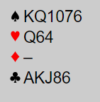 Merk at nord var giver, og SKIEN sin nord passet. Litt et stilspørsmål, men mange åpner ganske flittig med slike 10 poengere, minst ti kort i to farger. Et argument for pass er kanskje at sparfargen er så svak, for det må åpnes med høyeste farge med 5-5.