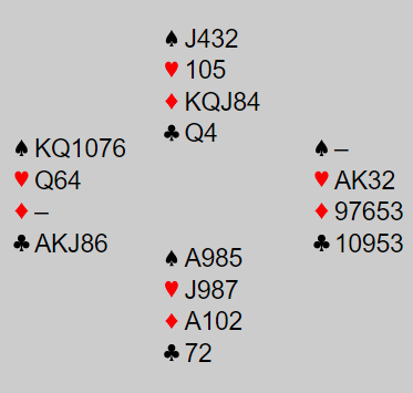 Det kom ruter ut til stjeling. Det er ikke mange tapere, men manglet stikk her, så spillefører sendte i vei spar konge og kastet en ruter fra øst. Syd vant med esset og spilte mer ruter til stjeling. Det var et godt stykke igjen før slemmen var spilt hjem, men to spar ble stjålet underveis, kløvervalget ble tippet korrekt (toppe ut damen), og da var det bra sjanser til slutt. Sparen kunne gå, eller det var en sjanse for fire hjerterstikk.