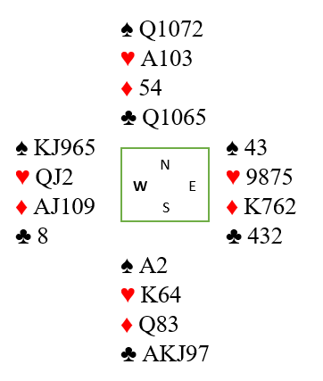 Uansett, her meldte i alle fall syd 1NT som viste en vanlig sterk grand. Like etterpå var han i 3NT, og vest spilte ut ruter knekt til østs konge. Tilbake kom ruter 2, og siden vest startet med AJ109 tok de de fire første stikkene i ruter. Vest skiftet så til kløver.