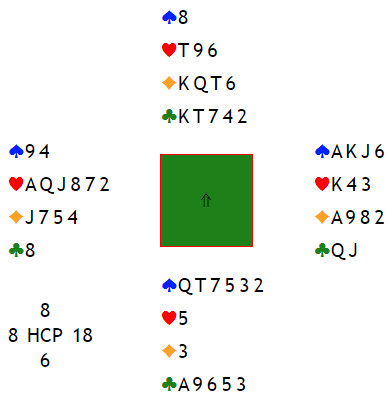 Lite trolig, for i så fall har nord syv eller åtte kløver, og han ga ikke lyd fra seg verken i åpning eller etter 1 ruter (øst), 1 spar fra syd og 2 hjerter fra vest. Etter det hoppet øst til 4 hjerter. Kan nord ha fire ruter?