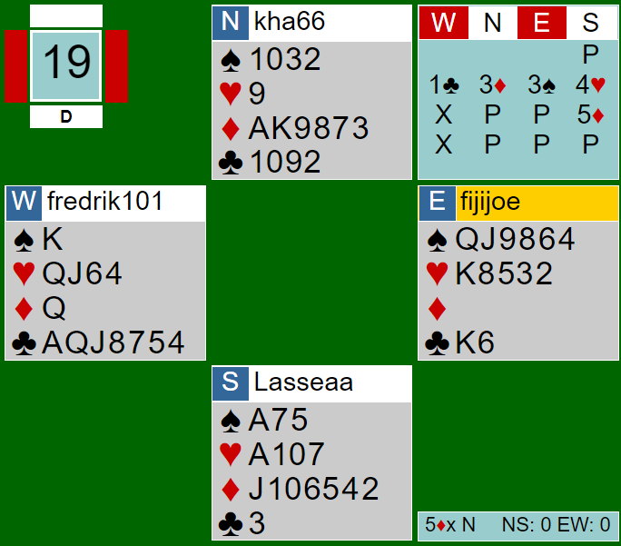 Mot 5 ruter doblet spilte øst ut spar dame, et naturlig utspill. Det skulle imidlertid vise seg å være et kostbart utspill. Det ser dog ut som om det vil bli to spartapere og en kløvertaper, men det ble det ikke.