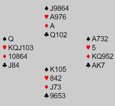 Kongen i utspill tok med seg spar dame i første stikk, og spillefører var allerede sjakk matt. Øst lasjerte et par ganger før hun stakk med spar ess. Da Marianne Harding (nord) kom inn på hjerter ess og tok sparstikkene sine kastet øst en kløver på den femte sparen. Det var en bet allerede, og Harding ventet med ruter ess. Hun spilte kløver 2 som spillefører stakk og spilte ruter konge til esset. Mer kløver presset ut den siste honnrøren der, og da syd kom inn på ruter knekt fikk forsvaret ett stikk i kløver også, fire bet!
