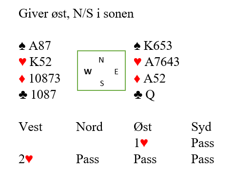 Min makker, Siv, var i sluttkontrakta 3 spar i Vest. Nord hadde åpna 1 ruter i andre hånd, og syd støttet enkelt ruteren i stedet for å melde av sparen sin. Dette burde denne kanskje gjort, men da hadde ikke dette blitt en fin spilleføring for Siv. Siv balanserer dermed med 2 spar, nord løfter til 3 ruter og jeg går i hardt med 3 spar, med pass rundt.