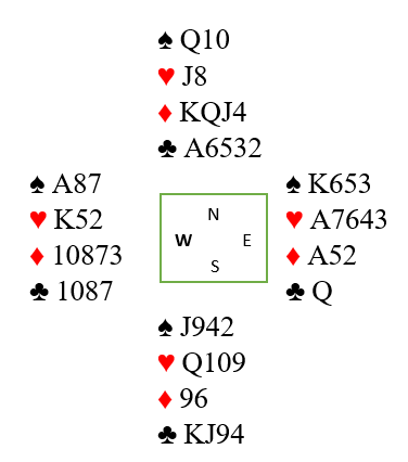 Etter pass fra Øst åpnet Syd med 1 NT, Vest gikk innpå med 2 ru, trolig Multlandy (ev Amundsen med hjerter eller spar+ kløver), Nord meldte 2 spar som Øst doblet (viser hjerterstøtte), Syd pass og 3 hj fra Vest før 3 spar fra Nord som ble løftet til 4 spar. Planlegg utspill.