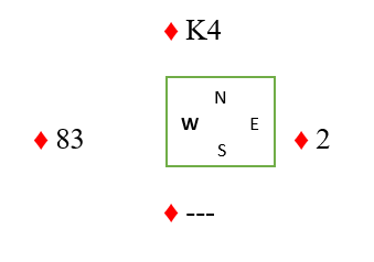 Hvis spillefører hadde tenkt nøye gjennom dette og innsett at ruter 5 var et viktig kort ville han spilt ruter 2 fra øst i fargens andre runde. Den tar med seg ruter 6, ruter 7 legges fra vest og nord må stikke. Da ser det slik ut: