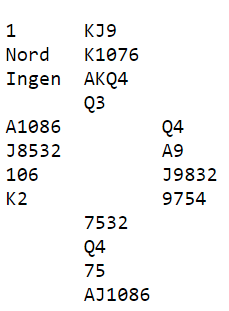 Jeg var giver og åpnet med 1 hjerter i gunstig sone. Hellen Johannesen doblet opplysende og etter pass fra Gerd Skjærstad meldte Trine Haug i Vest 1 spar (ca 4+ og max ca 8 hp). Jeg så jo at motparten har best kort men vi god fordeling og hoppet derfor til 3 ruter. Fra Øst kom så 4 spar, makker hadde til 5 ruter men etter to ganger pass sto Øst på med 5 spar. OK, pass til meg igjen men soner tatt i betraktning meldte jeg 6 ruter som stamp og ble doblet av Helen.