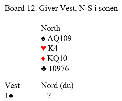 Vest la liten spar på utspillet, nord vant billig, og så gikk hun på kløveren. Det er jo enkelt å etablere to stikk i kløver pga. 10-9 i fargen, også de mellomkortene et pluss i vurderingen av nords hånd selv om 10-9 ikke regnes som honnørpoeng.