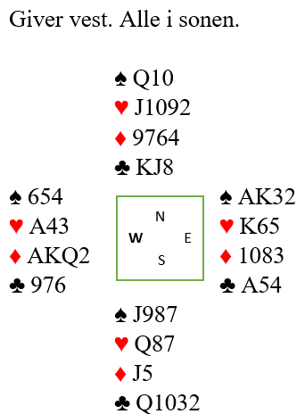 Syd overførte til hjerter og meldte så 3NT som ble kontrakten. Så de var i utgang helt bevisst meldt hvor det kun var 23 poeng til sammen! Og 3NT var det ingen problemer med å vinne!