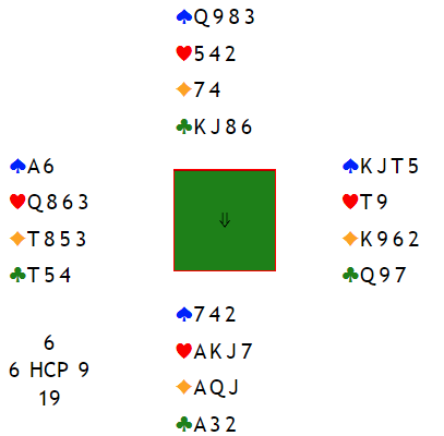 Det er to kløverstikk hos syd, og de gir avkast for to ruter. Det ser imidlertid ut til at det fortsatt vil bli en en rutertaper, så trumfen bør helst løses uten taper. Det går selvsagt bra nesten alltid, kun 3-0 sits i trumf den ene eller andre veien, og du gjetter feil med hvilken honnør du starter med gir trumftaper.