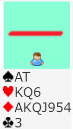Som du kan se var det bildet av kortene hennes helt på jordet. Men om det hadde sett omtrent slik ut ville lilleslem i hjerter vært en fin kontrakt, for jeg hadde kløver ess. Og 6 hjerter ble hva jeg meldte. Geeske ga opp og passet. Fra hennes synsvinkel kunne godt dette være ganske så perfekt, hvis jeg hadde femkorts hjerter. Mye tenking, ingenting korrekt...: