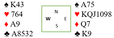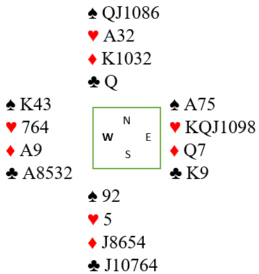 Øst havner i 4 hjerter etter at nord har åpnet med 1 spar. Idet øst melder inn 2 hjerter bør vest vise en god løft med overmeldingen 2 spar (såkalt cueraise). Da finner de enkelt utgangen som er nedlegg.