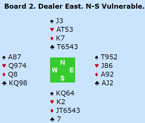 Ved det andre bordet passet vest. Det ser litt merkelig ut i gunstig sone, men forklaringen jeg har funnet er at paret spiller med andre 2 åpninger. Deres 2 ruter i gunstig er «Ekrens», begge major, og 2H/2S åpning viser den meldte fargen og en minorfarge. Selv liker jeg ikke å gi bort muligheten til å åpne med svake 2. En kan diskutere frem og tilbake hva som er best system, men det blir egentlig fånyttes. I noen spill vil det norske Ø/V-parets 2 åpninger fungere bedre. Jeg tipper at hun tenkte litt på en «fresk» 3 hjerteråpning, men det er kanskje litt mye «møllers tran»?