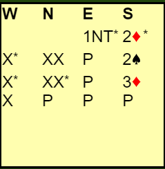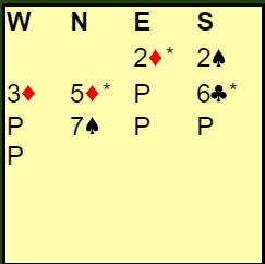 Helness-Helgemo sin innmelding 2 ruter mot 1NT er flertydig og viser hjerterfarge, eller fire-korts spar og en lang minorfarge. Vest doblet (verdier), og nord måtte finne ut hvilken versjon syd satt med. Det norske paret landet i 3 ruter.