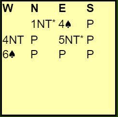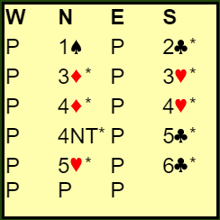 Øst sin 2 ruter var i dette tilfellet svake 2 ruter. Nord sin 5 ruter var Exclusion Key Card Blackwood, dvs. hun spurte etter nøkkelkort utenom ruteren. Heskje viste to nøkkelkort (spar konge og kløver ess). Det var nok for Vist som sa 7 spar.