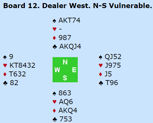 Spillet var en formalitet, tretten enkle stikk og slemsving inn siden N/S ved det andre bordet stoppet i lilleslem. Nesten halvparten av N/S-parene var kun i lilleslem.