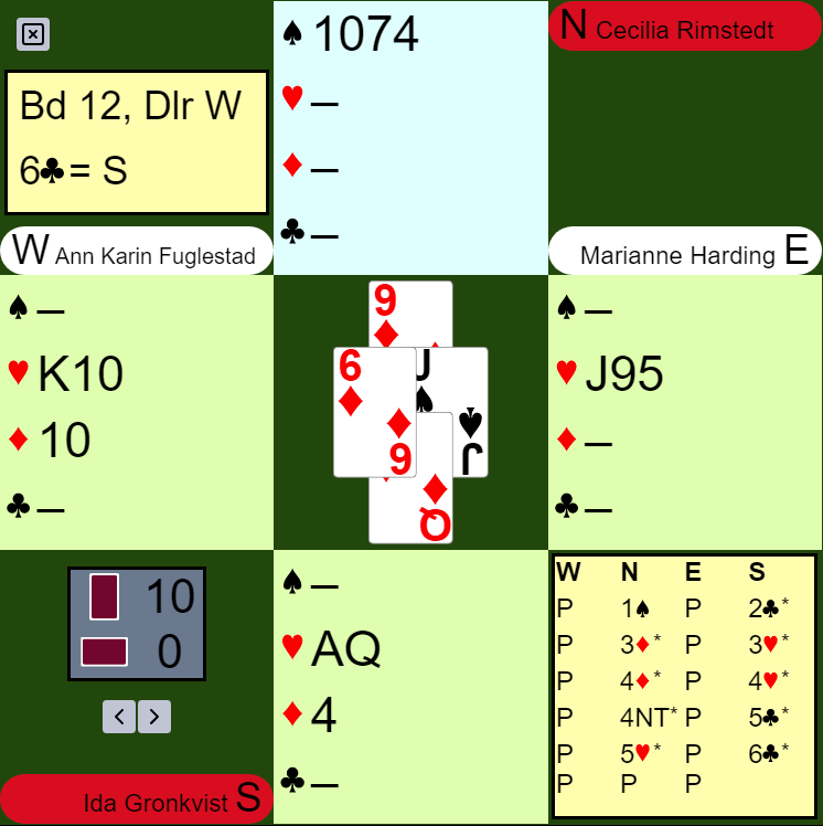 Nå fulgte ruter 4 til vests tier før hun måtte avslutte med hjerter unna kongen til A-Q saksen, Sverige +1370.