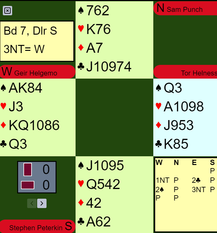 Det er typisk at Geir Helgemo gjorde det riktige her. I dette tilfellet var han imidlertid godt hjulpet av motpartens metoder. For på systemkortet til Punch-Peterkin som satt N/S står det at mot NT.kontrakter er knektutspill det høyeste kortet. Fra for eksempel AJ10x spiller de ut tieren. Vel å bra som metode kanskje, men i dette tilfellet avslørernde. Så Geir visste at esset satt hos syd om ikke nord hadde "faket" og spilt ut irregulert i forhold til sine metoder. Geir la lavt, knekten vant stikket og esset hos syd tok tredje stikk. Slik så hele spillet ut: