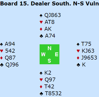 Merk at ved begge bord åpnet nord med 1NT med 14 poeng og 2-2-4-5 fordeling. Hånden er god og kanskje verd 15 med så god femkorts farge, men hva med fordelingen? Et viktigere argument for grandåpning enn at hånden er verd noe mer enn de 14 man teller opp er den håpløse gjenmeldingen nord får om han åpner med 1 kløver. Han kan si 1NT andre gangen, men har litt for gode kort til det. Å si 2 ruter vil bli revers, og det har han på ingen måte til. Nords andre melding kan selvsagt være 2 kløver, men det er også ubehagelig med femkorts farge. Grandåpning med dette gir ingen garantier, men trolig vil det være åpningsmeldingen som gjør det enklest for makkerparet.