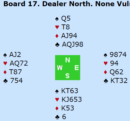 Noen spill senere var kontrakten en hardmeldt 3NT ved begge bord med disse kortene:
