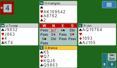 Rogeir Paulsens (syd) sin 1NT var overføring (viste kløver). Senere meldte han kanskje litt sprekt (?) 6 ruter, men det var på alle måter riktig (5 spar stod jo). Slemmen ble doblet, og øst kan selvsagt ikke klandres for at han ikke fant "double dummy utspillet" liten kløver som kunne ført til hjerterstjeling og en bet.