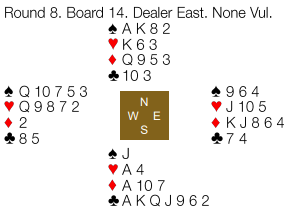 På kløver 9 med avkast av ruter dame fra nord måtte øst kvitte seg med en hjerter for å holde ruteren. Da var det vest sin tur til å føle presset i neste stikk, og ruter ess gjorde slutt på han og. Han kunne kastet spar 10, men i så fall ville spar 8 gitt det trettende stikket. Så også han måtte kvitte seg med en hjerter. Da forsvant spar 8 fra nord, og hjerter ess, hjerter til kongen og hjerter 6 (eller hjerter 3!) ga det trettende stikket siden fargen nå satt 2-2.