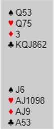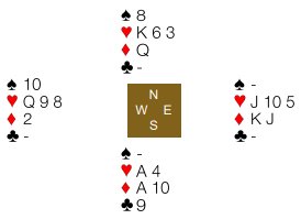 I den kampen jeg fulgte passet vest ved det ene bordet idet syd åpnet med 1NT. Nord hadde system (en "Puppet Stayman" variant) til å finne ut om det var 5-3 tilpasning i hjerter og endte i 4 hjerter. Vest spilte ut kløver 9. Hvordan ville du spilt denne utgangen?
