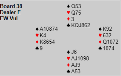Syd åpner med 1NT slik de fleste spiller om de bruker 15-17NT. Vest går inn med 2 spar som viser spar + en minor. Hvordan er du og din makker sitt system over det? Kan N/S finne 5-3 tilpasningen i hjerter etter denne starten? Men så er det viktigste spørsmålet: er 4 hjerter så mye bedre enn 3NT her?