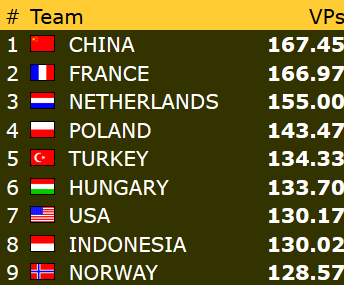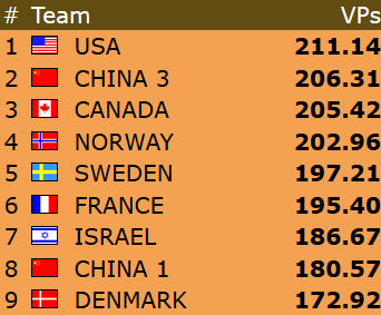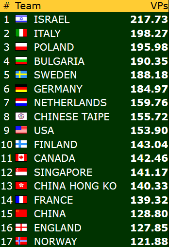 Norges U16-lag hadde på papiret en tøff dag med fire kamper mot motstandere som alle var med i kampen om å sikre plass i sluttspilet. Men kidsa kom godt fra det. Først ble det knepne seire mot Frankrike og USA, før det ble en litt større seier mot Israel og storseier mot Kina 2 i dagens siste kamp. Etter å ha sanket 54 VP i dag er kidsa med det klare for kvartfinale allerede før den siste kampen i grunnspillet mot England. Det er likevel viktig å få med seg et bra resultat fra den kampen for å komme så høys som mulig på den jevne tabellen. Det kan nemlig gi lettere motstand i kvartfinalen.