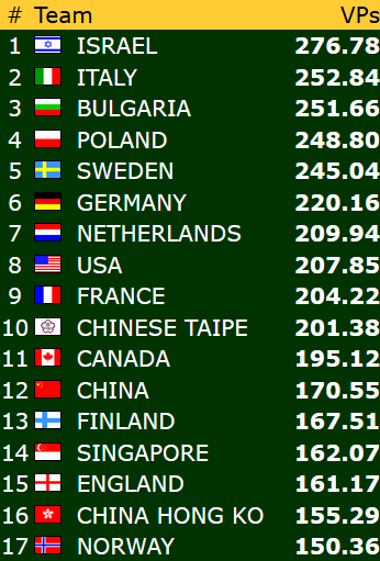 Jenter (15 lag deltar): Norge - Thailand 16,72 - 3,28 Norge - Ungarn 1,59 - 18,41 Oversitt i kamp 3: 12 VP