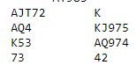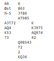 Det ser ut som et kjedelig spill, tilsynelatende elleve enkle stikk. Men det er et lite poeng som kan gi ekstra sjanse for det ellevte stikket. Ruteren kan jo sitte 4-1. Riktig spill er å ta kun to runder trumf (trumfen sitter 3-2), så to runder ruter. Hvis ruteren sitter 3-2 tar du ut den siste trumfen og forlanger resten. Men ekstrasjansen nå er at samme motstander har fire ruter sammen med den tredje trumfen og følger farge hele tiden. Da kan en fjerde runde ruter trumfes med vest sin siste trumf. Og slik satt det: