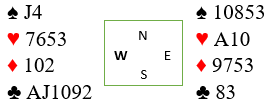 Min makker stakk første kløver og forsøkte på en kombinasjon av et håp om at vest hadde hjerter ess, eller at øst skulle gjøre feil. I andre stikk ruter til damen, så liten hjerter derfra. Hvis øst sover og legger liten fra esset får spillefører stjålet seg ett stikk i hjerter og kan ta sine ni stikk. Den psykologiske varianten er nok en dårlig sjanse mot en god spiller på østs plass (og det var det). Riktignok er «lavt i andre hånd» en regel, men regler har som kjent unntak. Og øst (om han har hjerter ess) bør med de kortene hos blindemann se at den eneste sjansen forsvaret har er at vest har A-J-10 femte i kløver og hoppe opp med hjerter ess før han sender kløver gjennom.
