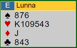 Karl Morten Lunna (H & O) åpnet etter to passer med 2 hjerter. Jeg skal ikke gjøre meg til noen dommer om hva som er best i dette tilfellet, pass eller svake 2 hjerter. Det er kanskje litt tilfeldig. Men å melde viste seg å fungere best denne gangen.