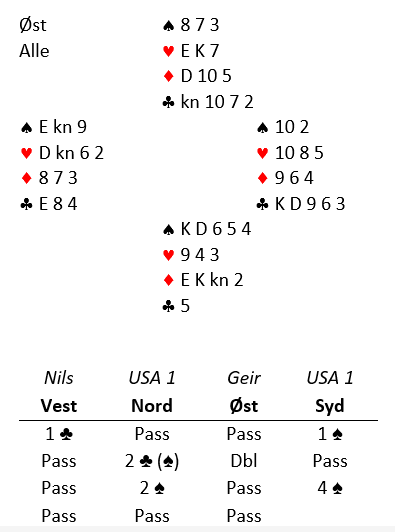Spillefører prøvde sitt beste ved å spille liten spar, men da kunne vest ta for spar knekt og spar ess. Dermed kunne det ikke trumfes mer enn to kløver hos syd, og det endte med en bet.