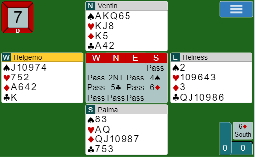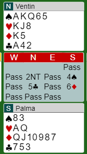 Kampen spilles nå, onsdag kveld norsk tid og overføres på BBO. Det startet med at laget med de to norske spillerne tok en liten ledelse bl.a fordi PALMA meldte en hårreisende slem som gikk to bet. Like etterpå meldte det samme paret nok en knallhard slem med disse kortene:
