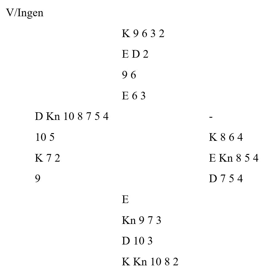 Jeg åpnet som Vest med 3 spar, passet rundt til Syd som doblet, ogNord var fornøyd med det. Utspill ruter ni som gikk til kongen, og spar ti ble tatt med esset. Kløver til esset og mer kløver til stjeling. Spar dame til kongen avslørte den ubehagelige sitsen, og mer kløver gikk til stjeling. Hjerter til esset, og ruter til bordets ess. Hjerter konge og hjerter til stjeling ga denne sluttstillingen: