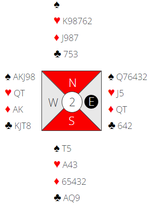 Her er kanskje tirsdagens merkeligste spill. Ø/V har 26 HP og ellevekorts spartilpasning, men i teorien kan de ikke vinne utgang! Ø/V på sin side har kun en ni-korts hjertertilpasning, og de kun har 14 HP til sammen, men de vinner 4H nokså greit,