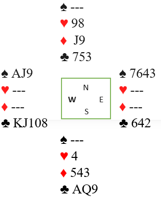 La oss si N/S tar to hjerterstikk og skifter til ruter (eller trumf). Spillefører tar nå av seg den andre ruterhonnøren og spiller seg inn på trumf dame (det eneste inntaket) i andre trumfrunde. Dette er igjen: