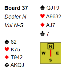 Vest fulgte altså opplegget deres og skiftet til ruter 9. Men øst hadde glemt den fine avtalen og trodde syd hadde ruter 10. Så da det ble lagt liten fra nord stakk han med damen. Da fikk de kun ett stikk i ruter for hjerteren lot seg godspille med 3-3 sitsen, kombinert med at trumfen også satt snilt.