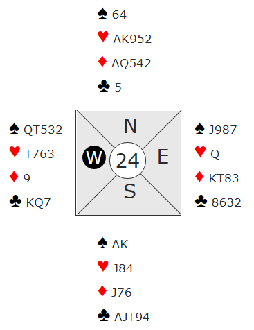 Mot oss spilte de 4 hjerter. Der er det nokså greit å vinne elleve stikk, men det er en måte å få tolv stikk på også. I alle fall med kløver i utspill fra øst som jeg spilte.