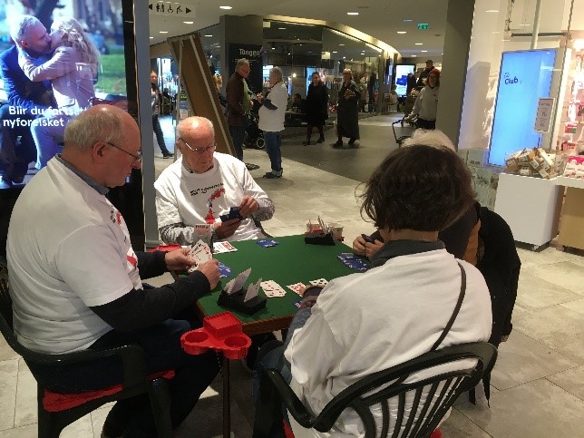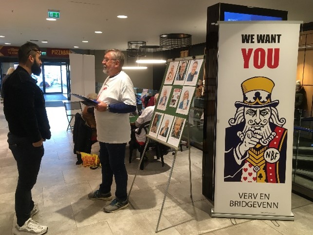 Heldigvis hadde vi fått tillatelse til å ha standen midt i den mest sentrale delen av senteret. Det var en fordel, men det betød ikke at arbeids-forholdene dermed var veldig enkle for våre «ververe». Som vanlig hastet folk fram og tilbake, og det var nok ikke alle som var forberedt på å stoppe opp for å ha en prat om bridge. Det var først og fremst medlemmene våre som sikret at denne standen ble en stor suksess. Vi hadde på oss «uniform» - T-skjorter fra NBF, og skiftet på å snakke med folk, og å ta «time-out» ved bridgebordet med kaffe og gode bridgeopplevelser med nye makkere.