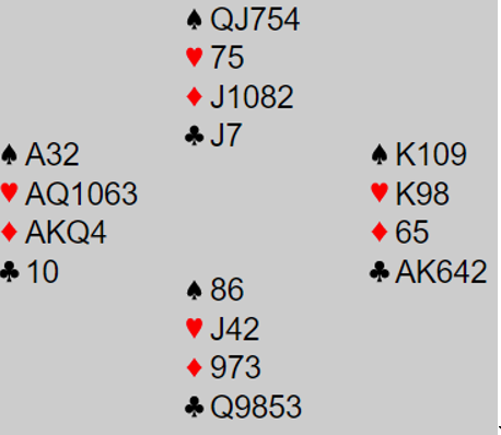 Det er forskjellige spilleplaner som kan funke her for å få alle tretten stikkene. Den enkleste er å spille A-K i ruter og trumfe en ruter før den siste trumfen er tatt ut. Faremomentet er at ruter sitter 5-2 og at den med dobbelton kan trumfe. En ruterstjeling gir ett ekstra trumfstikk (stjeling på den korte trumfhånden). Slik det satt ble det tretten stikk for de tre parene som var i 7 hjerter, og de som var i lilleslem fikk også tretten.