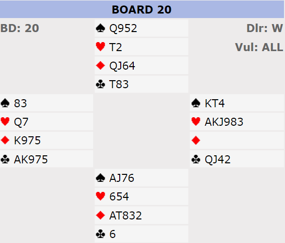 Ved det andre bordet stoppet vårt lag i 4 hjerter, spilt av vest pga. en spesiell systemvariant. De noterte +650 etter spar ut fra nord, og de var nok på en måte fornøyde med å ha stoppet i utgang siden spar ess satt bak. Men det var ingen grunn til å være fornøyd, spillet kostet 13 IMP.
