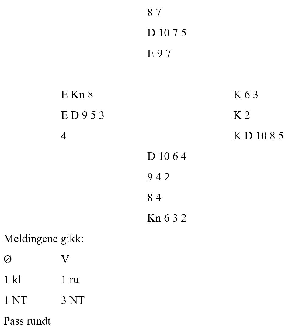 Det er usikkert hva slags plan Odd Harald egentlig hadde, men han spiller hjerter knekt fra bordet. Og denne dekker nord med dama, og dermed er det ikke lenger grunn til å tenke - og kontrakta går hjem. Hva Odd Harald ville gjort hvis nord hadde lagt liten vites ikke.