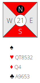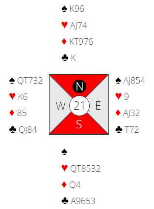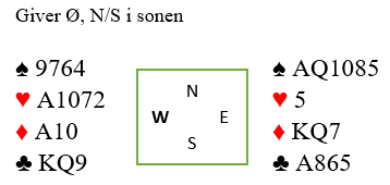 Vi var i gunstig sone med Terje (N) somgiver og det startet med to ganger pass til meg. Gode kort i hvert fall hvis det er tilpasning og etter 1 hjerter fra meg med pass fra Vest svarte Solli 2 ruter. Det lover 10+ poeng og 5+ i fargen og da vokste min hånd nærmest til skyene i styrke. Hva ville du gjort videre?