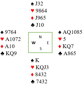 N/S kan vinne 6 hjerter siden hjerterfinessen går. I hjerterkontrakt kan spillefører trumfe to kløver underveis, og da blir den femte kløveren godspilt. Ø/V får kun for ruter ess. En bør i spilleføringen forsøke å kombinere med å godspille ruteren i tilfelle kløver sitter 5-2.