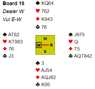 Fra vest kom liten kløver i utspill til liten fra syd og knekten. På kløver tilbake la øst damen og kongen vant stikket. Det var syv stikk fra topp, og ett til i spar, men øst måtte ikke få fatt i kløverstikkene sine. Så den fargen måtte sitte 6-2 hvis dette skulle gå bra. Spar til kongen vant neste stikk, og det var åtte sikre. Nå måtte det sitte helt perfekt for å få tak i det niende. Det kom dog litt av seg selv. Fem ganger ruter fulgte og dette var igjen: