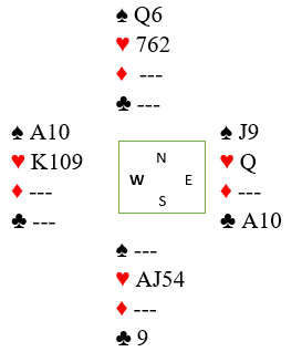 Nå var det bare å ta hjerter ess som tok med seg øst single dame, så mer hjerter. Uansett hva vest setter seg igjen med på det tidspunktet må han gi spillefører det niende i spar eller hjerter (hvis han for eksempel holder igjen en hjerter til vil hjerter knekt gi det niende).