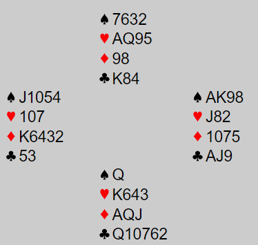 Jeg (S) åpnet med 1 hj, pass fra Øyvind og løft til 2 hj fra Arne (N) før Arne Aarø la inn en opplysende dobling der alle var i faresonen. Arne har god fordeling med lengde i alle tre andre farger men Øyvind hadde bare hagel der. Hjerteren var OK og med pass som svar ble det betedobling av 2 hjerter. Og her satt alt helt bedrøvelig for meg, det ble følgende tapere, 2 i spar, 2 i hjerter, 1 i ruter og 1 i kløver og dermed -1 og 200 ut. Det var ren topp for Aarø- Larsen.